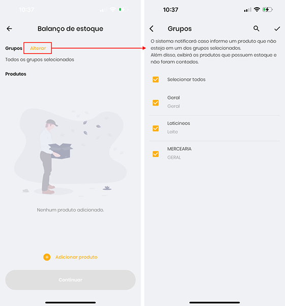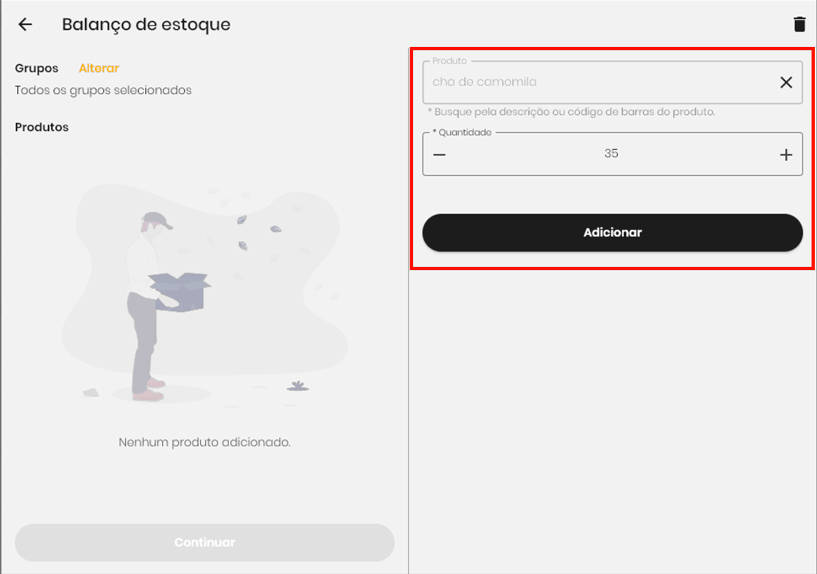 - Adicionar: clicando nos produtos, é possível editar o estoque de cada um e, ao clicar em Adicionar, o produto será adicionado ao balanço com a contagem de estoque informada.