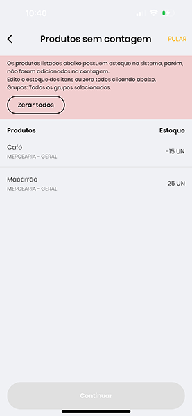 - Pular: Este botão mantém o estoque dos produtos listados e não os adiciona na contagem.