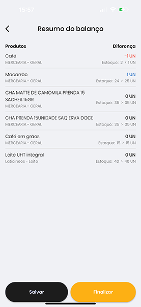 - Finalizar: salva o balanço e sincroniza em nuvem (quando habilitada a sincronização). Ao finalizar, a quantidade de estoque dos produtos é substituída no cadastro e a edição do balanço é bloqueada. Balanços finalizados também podem ser conferidos nos relatórios.