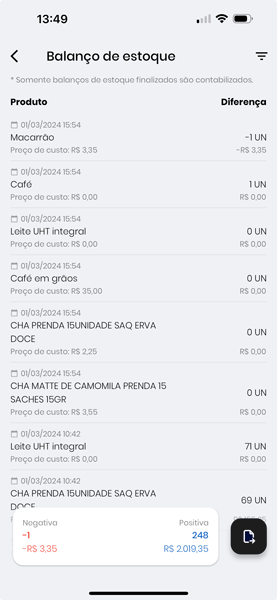 - Em diferença, é mostrada a diferença entre o estoque anterior e o substituído no balanço, além da soma de custos desta diferença.